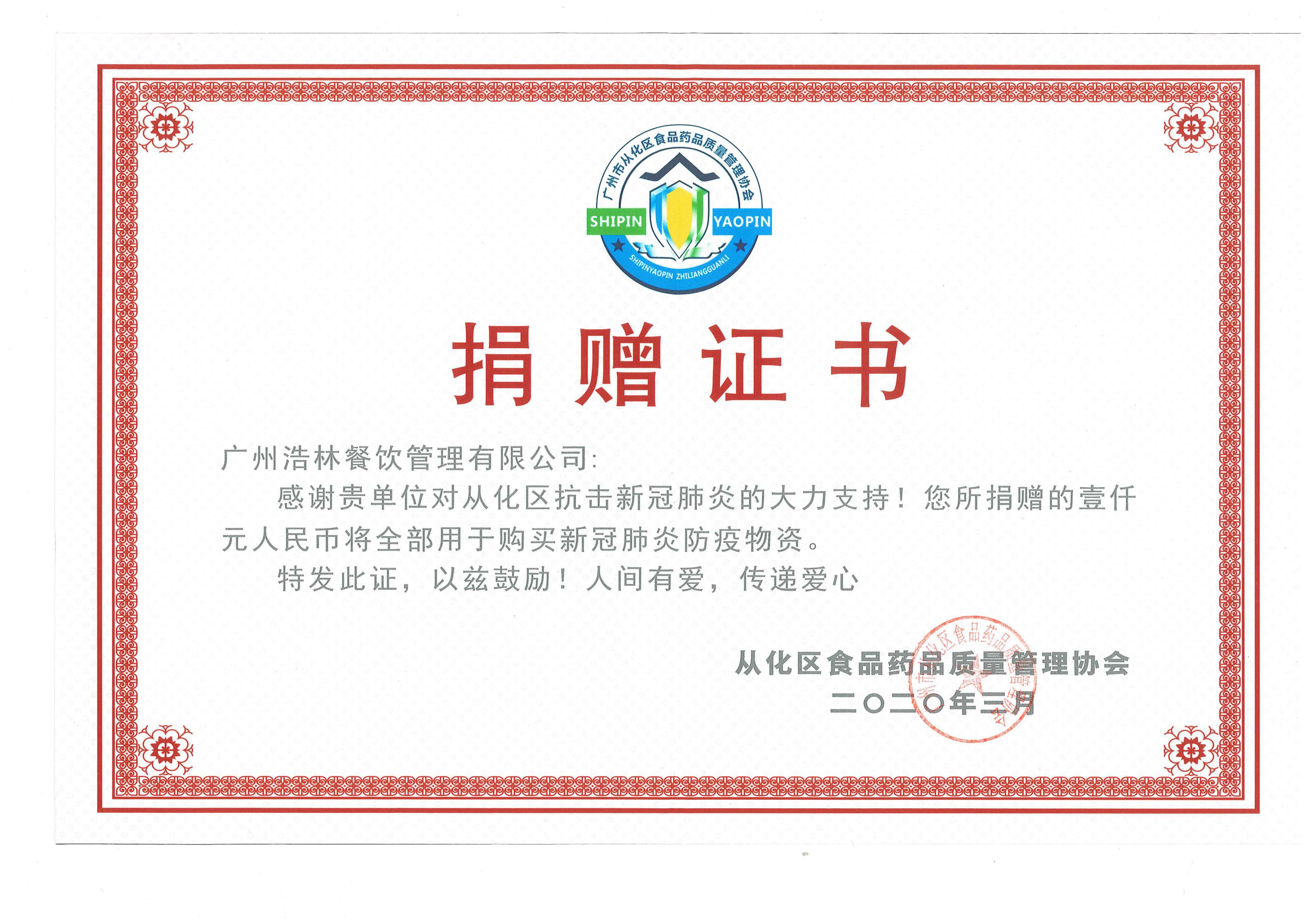 从化区捐赠证书...