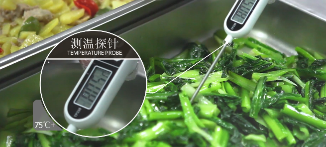 在烹饪间新鲜的食材经过师傅们的巧手变成各式各样的美味佳肴,菜品出锅后温度达到75℃以上说明菜品