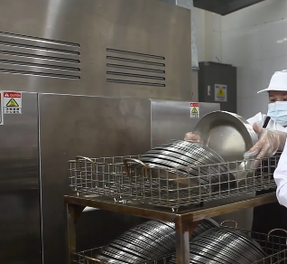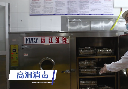 供餐结束后所有的餐具都会经过我们的高温洗碗机进行冲洗,冲洗完毕后会餐具将会放进消毒柜内经过45分钟,120度高温消毒