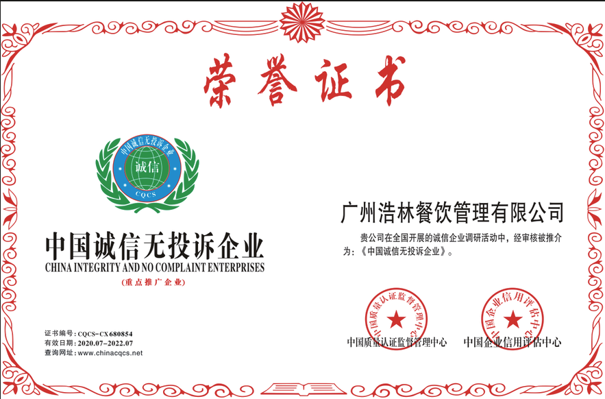 广州浩林餐饮管理有限公司贵公司在全国开展的诚信调研活动中,经审核被推介为:《中国诚信无投诉企业》。