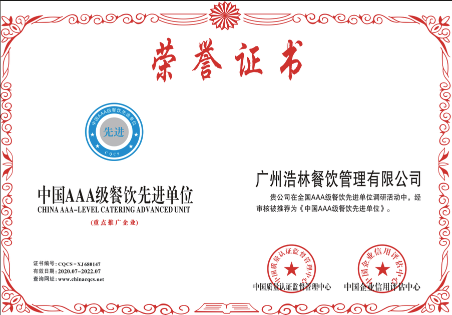 广州浩林餐饮管理有限公司贵公司在全国AAA级餐饮先进单位调研活动中,经审核被推荐为《中国AAA级餐饮先进单位》。