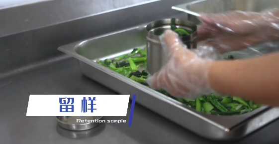 为了保证食品可追溯性,每餐每道菜留取150G菜品装入留样罐中,粘贴标签后放置专用留样冰箱内保存48小时