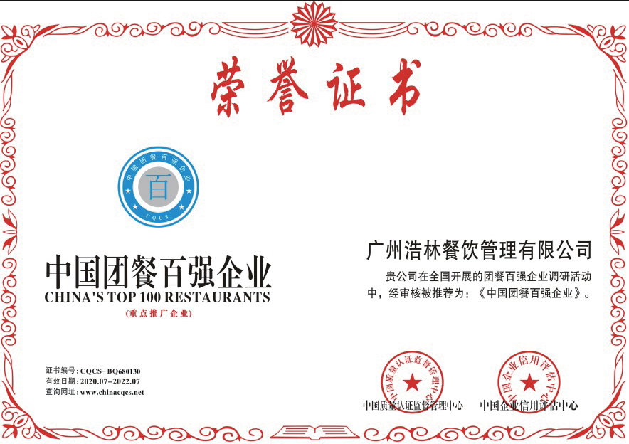 广州浩林餐饮管理有限公司贵公司在全国开展的团餐百强企业调研活动中,经审核被推荐为:《中国团餐百强企业》。