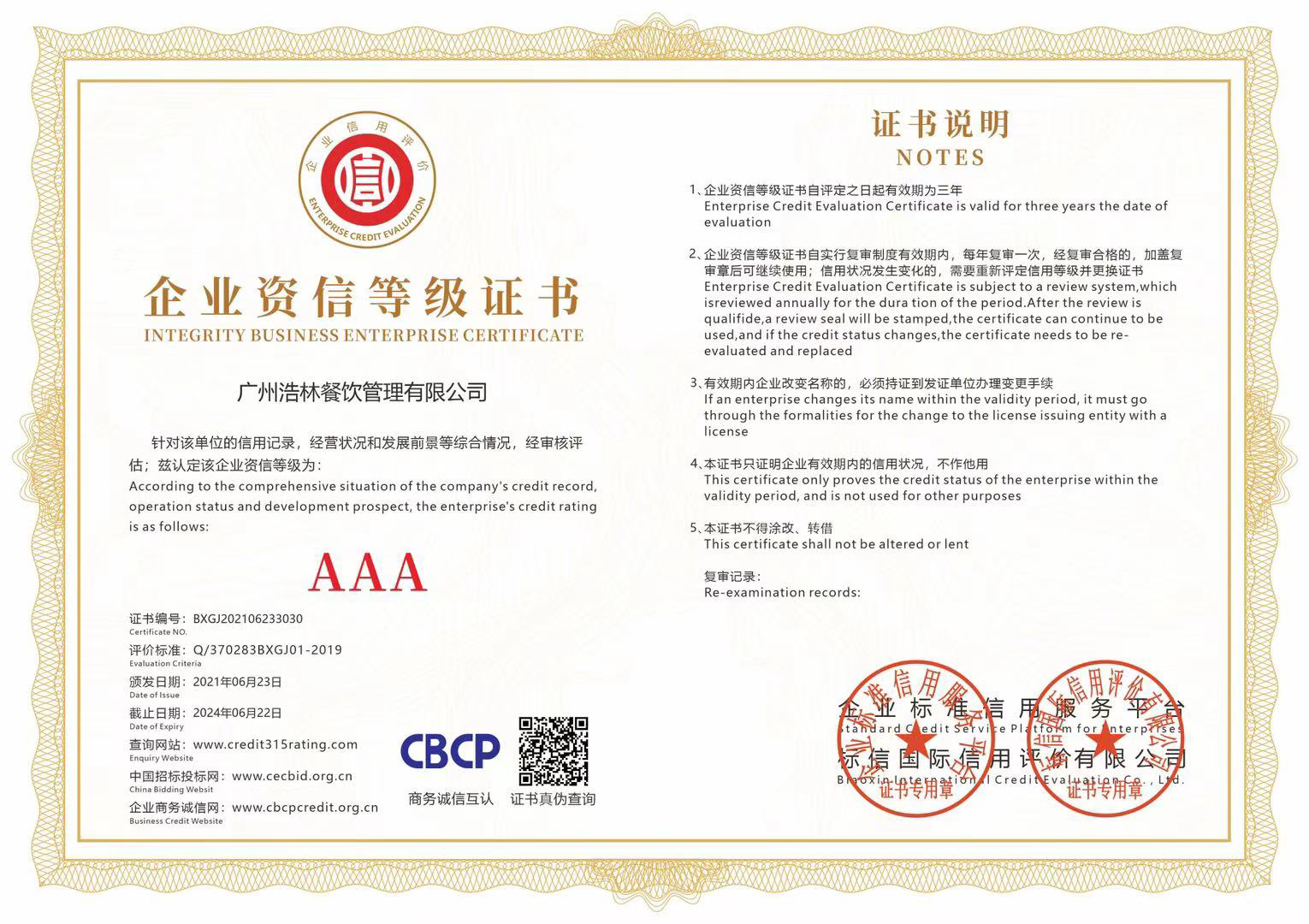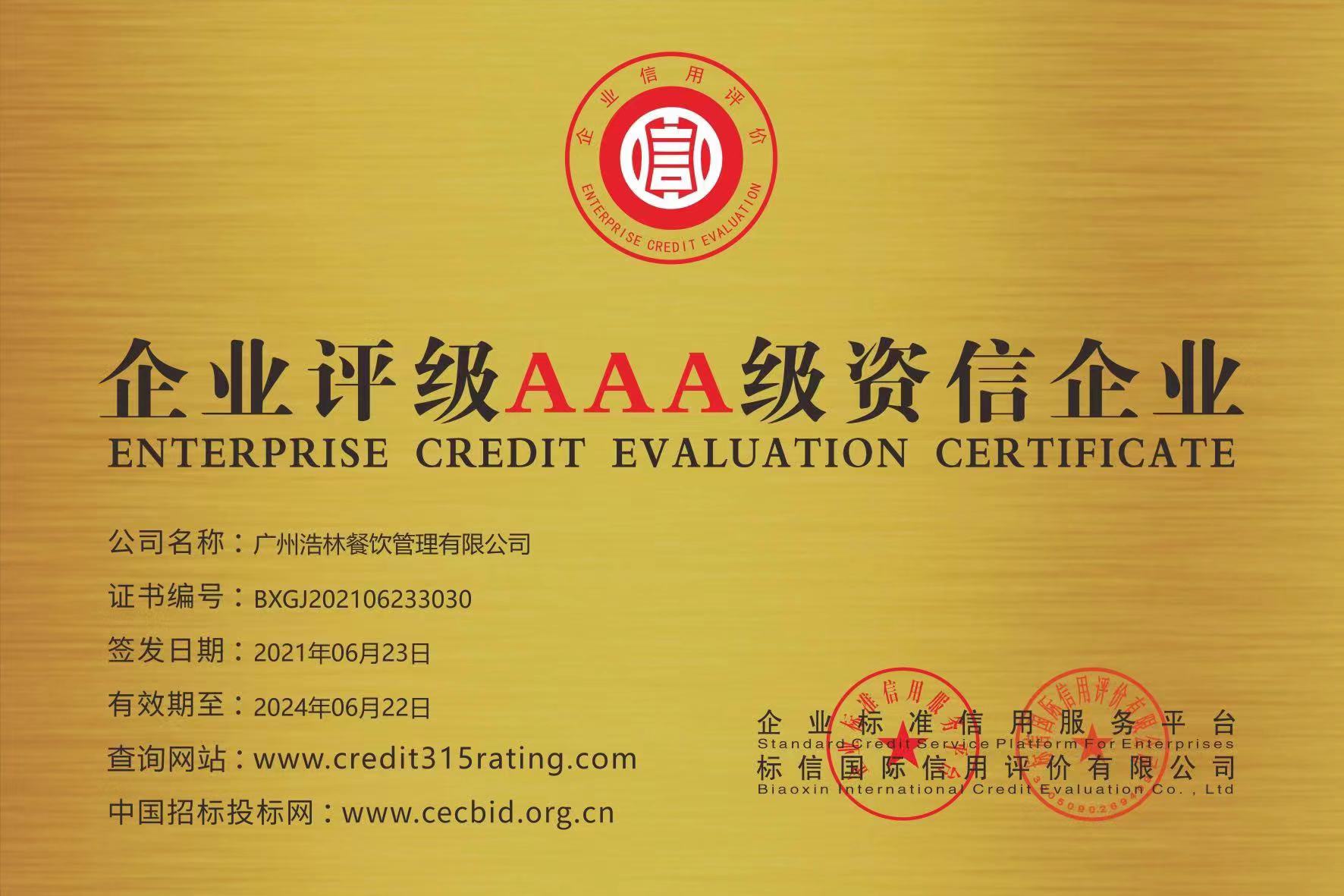 广州浩林餐饮管理有限公司:受贵单位委托,标信国际根据依据Q/370283BXGJ-2019《企业信用评价标准》条款进行信用评价,标信国际针对企业提供数据及公开信息采集结果进行信用分析,经机构评审认定为:贵单位信用等级为AAA级,诚信管理级别为A,展望为稳定。